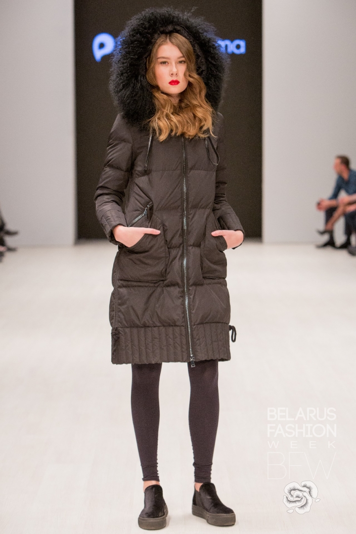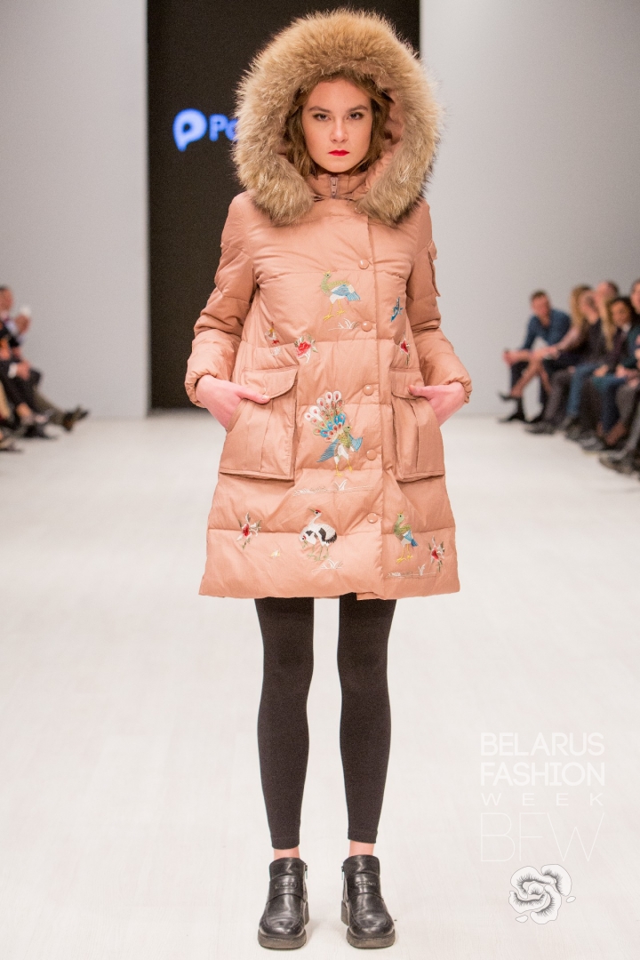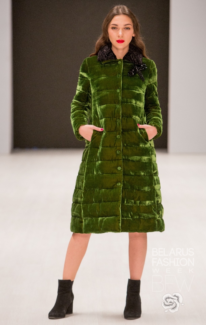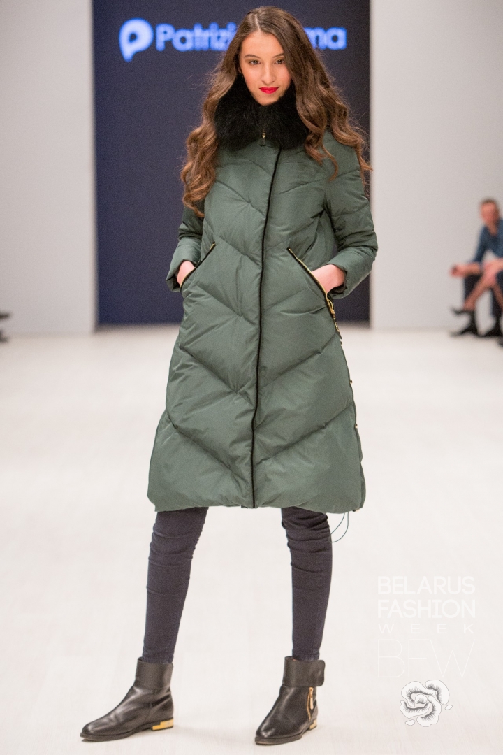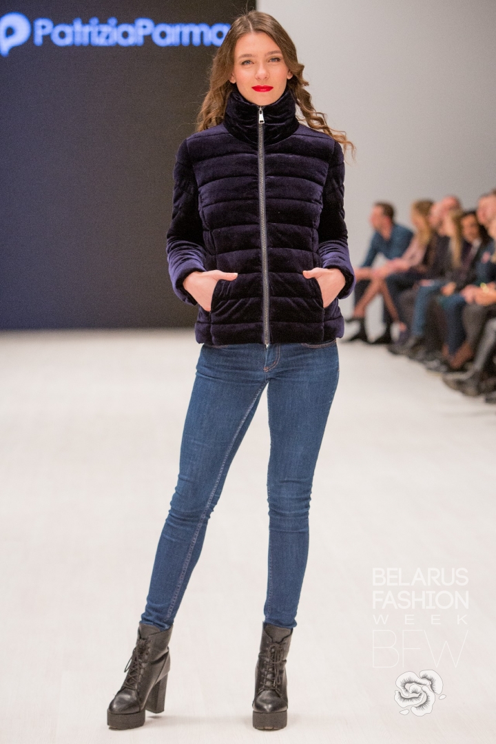 Patrizia Parma презентовала верхнюю женскую одежду: пуховики и куртки из стеганной бархатной ткани винного, пудрово-розового, глубокого зелёного цветов, украшенные бисерной вышивкой, элементами из натурального меха.