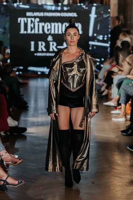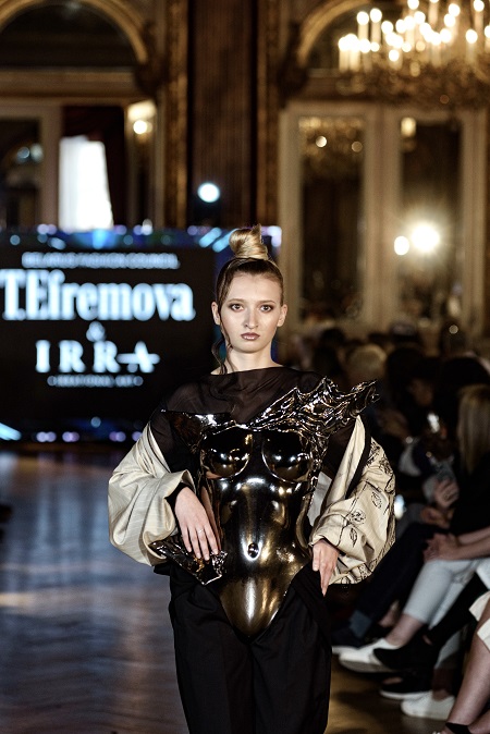 Коллаборация Татьяны Ефремовой и Ирины Ромбальской родилась на стыке моды и современного искусства. Дизайнер и художник объединились, чтобы усилить философию личных брендов и в пластике, хроме, метализированных тканях и энергии ручной лепки донести свои миры. Коллекция с одной стороны наглухо скрывающая наготу, с другой - обезоруживающе открытая. Свободная, отстраненная, многослойная не только в дизайне, но и смыслах. Зеркальные поверхности корсетов подчёркивают откровенную женственность и мужественность. Потертая краска на одежде уравновешивает сложность золота и бронзы.