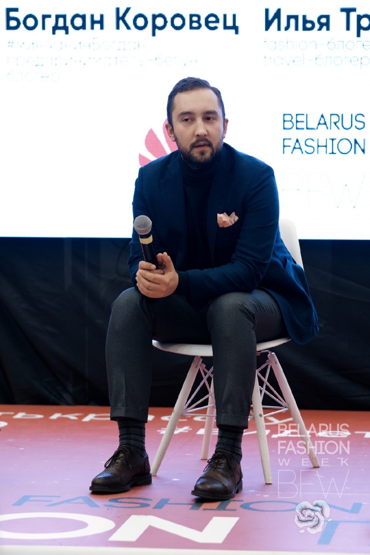 Завершили день выступлений на тему моды предприниматель-бегун и блогер Богдан Коровец в дуэте с fashion- и travel- блогером Ильёй Трифоненковым. Стильные минчане порассуждали на тему перспектив мужской моды, её трендах, стилях и присущих атрибутах.